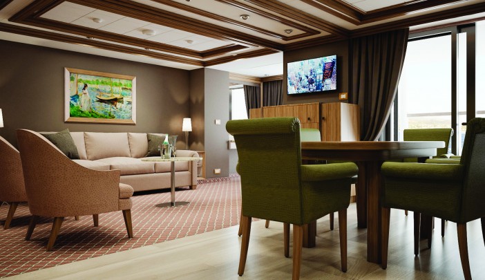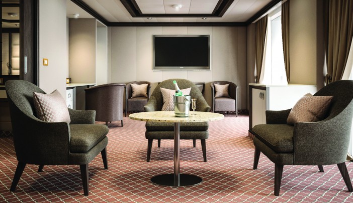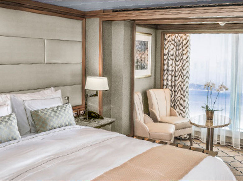 The Panorama Suite provides generous living space for voyagers. Located lower bow, the Panorama offers all the comfort and attention to detail that you can expect aboard. A generous expanse of interior comforts — elegant décor, stunning marble bathroom and ample seating area, make this a cosy home away from home. The seating area of the Panorama Suite has plenty of room to relax, while large picture windows frame panoramic ocean views.Marbled bathroom provides guests with a full-sized tub and separate shower, complete with Bulgari® bath amenities or a choice of other European Brands.Premium mattresses and Pratesi® fine bed linens and down duvet covers offer guests the ultimate level of comfort, and along with an interactive Media Library, the suites are equipped with a refrigerator and bar setup, stocked with your preferences and Flat screen HD TV.