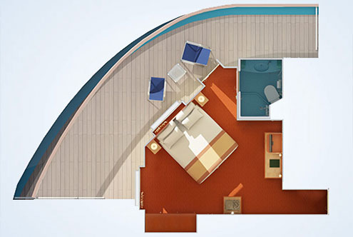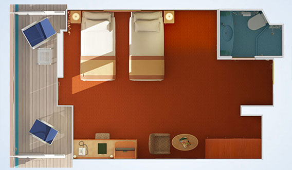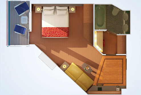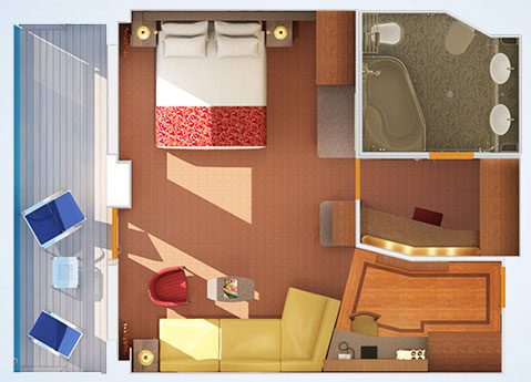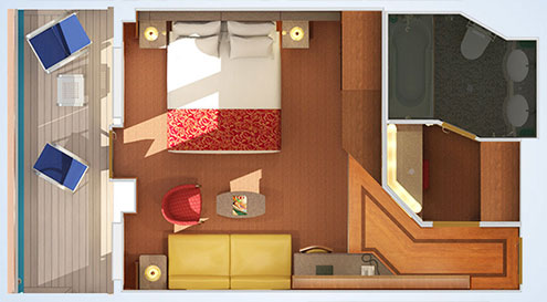Two twin beds (convert to king) and double sofa bed. A trundle bed will be provided if a fifth guest is booked to this stateroom. Sofa, armchairs and coffee table. Desk and seat. Full bathroom with shower/whirlpool tub/ double sinks. Walk-in dressing area with vanity table (and small sink), seat and ample closet space. Private large balcony with patio chairs and table.